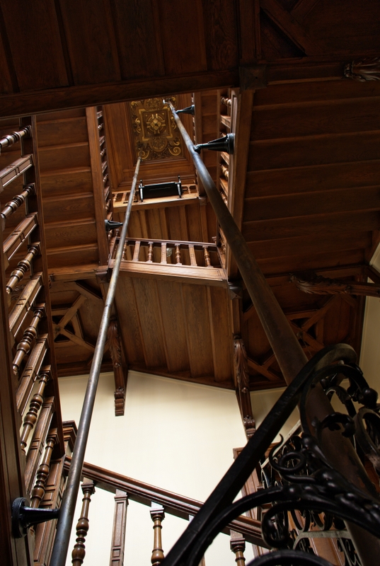 En voilà un. De bois et de fer forgé, construit par la société Roux-Combaluzier, emblématique de la production. Il ne dessert qu’un seul étage, le troisième de l’immeuble. La cabine est sculptée et pour s’adapter à la cage d’escalier elle a une forme rectangulaire avec deux pans cassés au fond. Il fallait fermer les portes à la main avant de démarrer.