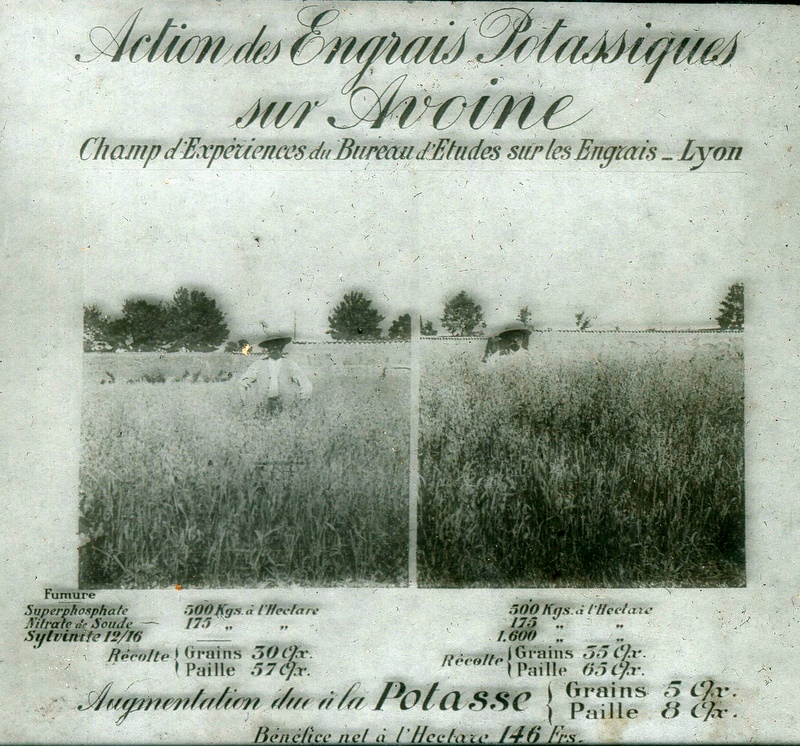Mais revenons à nos plaques de verre. Habillées de tissu gommées, elles sont regroupées dans une boite en bois noirci surmontée d’une inscription difficilement lisible: Bureau d’étude sur les engrais, 20 avenue de No…. LYON, La Potasse, collection de 24 plaques. Que voici: